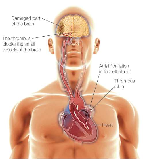 Wanneer zo’n bloedstolsel in het hart op een gegeven moment loslaat, komt het in de bloedstroom terecht en wordt met het bloed meegevoerd naar de hersenen. Daar zijn de vaten zo klein dat een verdere doorstroming niet meer mogelijk is. Dit is het moment dat het stolsel het bloedvat afsluit en daarmee verdere bloeddoorvoer blokkeert. Een gedeelte van het hersenweefsel krijgt dan geen zuurstof meer waardoor het afsterft. Dit noemen we een beroerte. Dit heeft vaak blijvende invaliditeit of zelfs de dood tot gevolg.